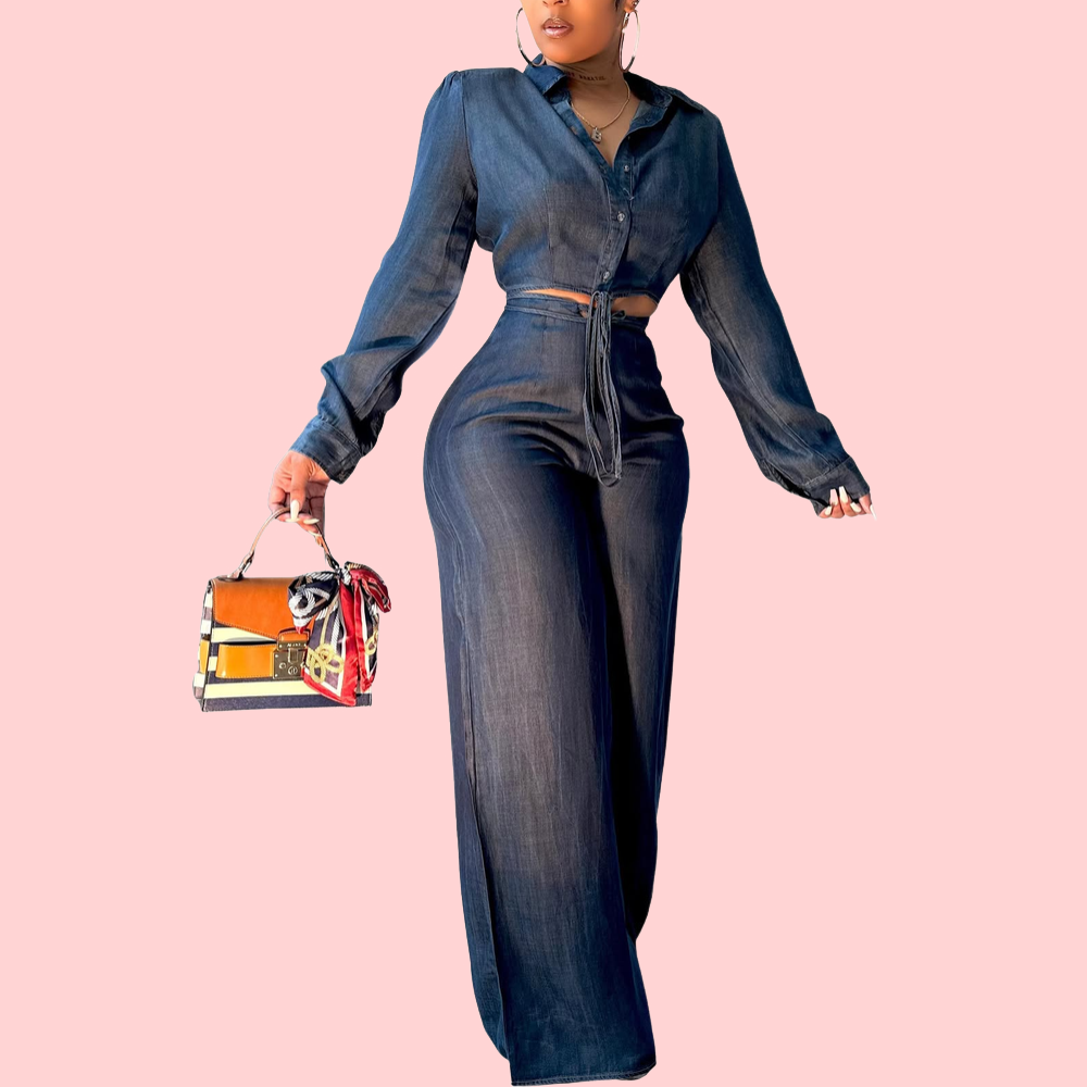 Long-Sleeve Denim Strappy Shirt & Jeans Set